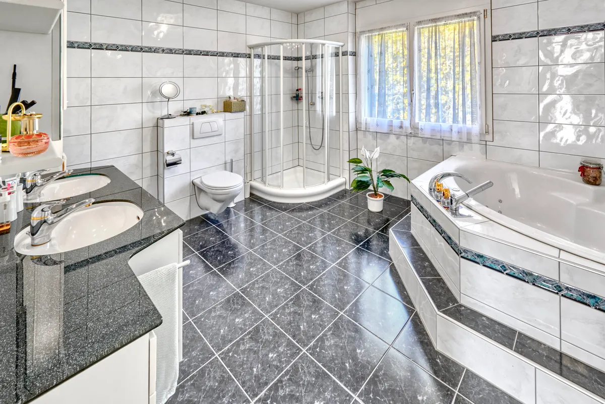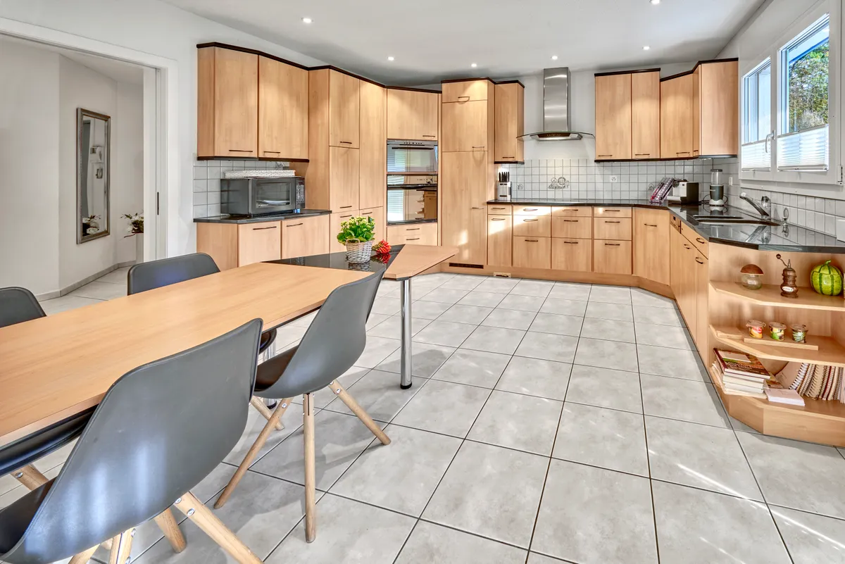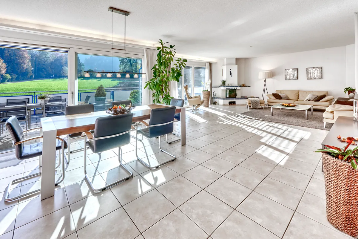 Im Obergeschoss befindet sich eine grosszügige 5.5-Zimmer-Attikawohnung mit rundum gelungener Raumaufteilung. Der lichtdurchflutete Wohn- und Essbereich mit Cheminée, die moderne Küche und die weitläufige Terrasse schaffen ein komfortables Wohnambiente. Drei Nasszellen, ein separates Büro, Waschküche und Abstellraum ergänzen das Raumangebot optimal.